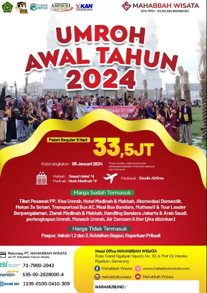 Assalamualaikum Warahmatullahi Wabarokatuh, Sahabatku yang berkeinginan melaksanakan ibadah Umroh! 🕋✨ Kami menyediakan Paket Perjalanan Haji Umroh 2024 terbaru khusus untuk warga Jateng dan sekitarnya. Nikmati kenyamanan menginap di hotel bintang ⭐️⭐️⭐️⭐️ hanya 300 m - 500 m ...